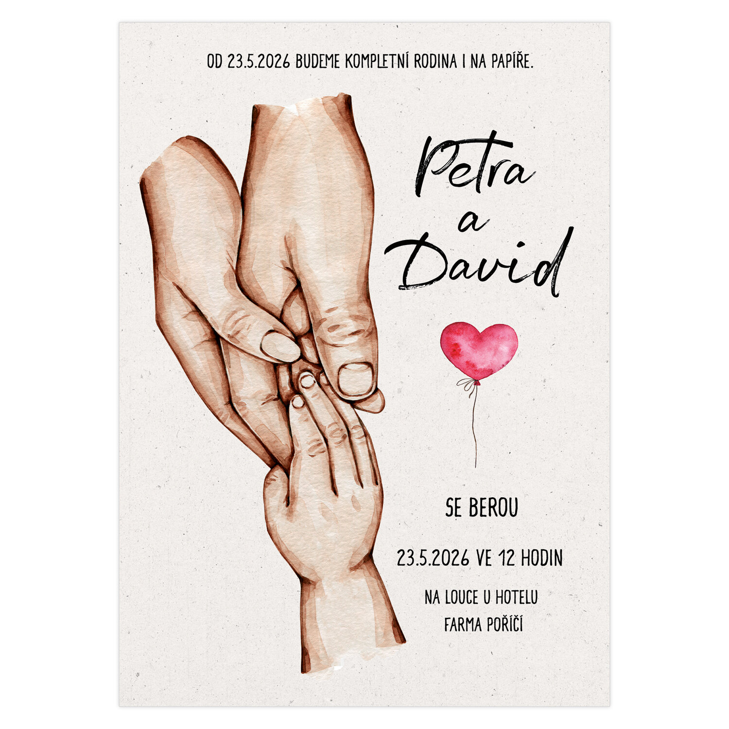 Kreslené rodinné svatební oznámení se spojenýma rukama dítěte a rodičů v jedno pevné rodinné pouto.