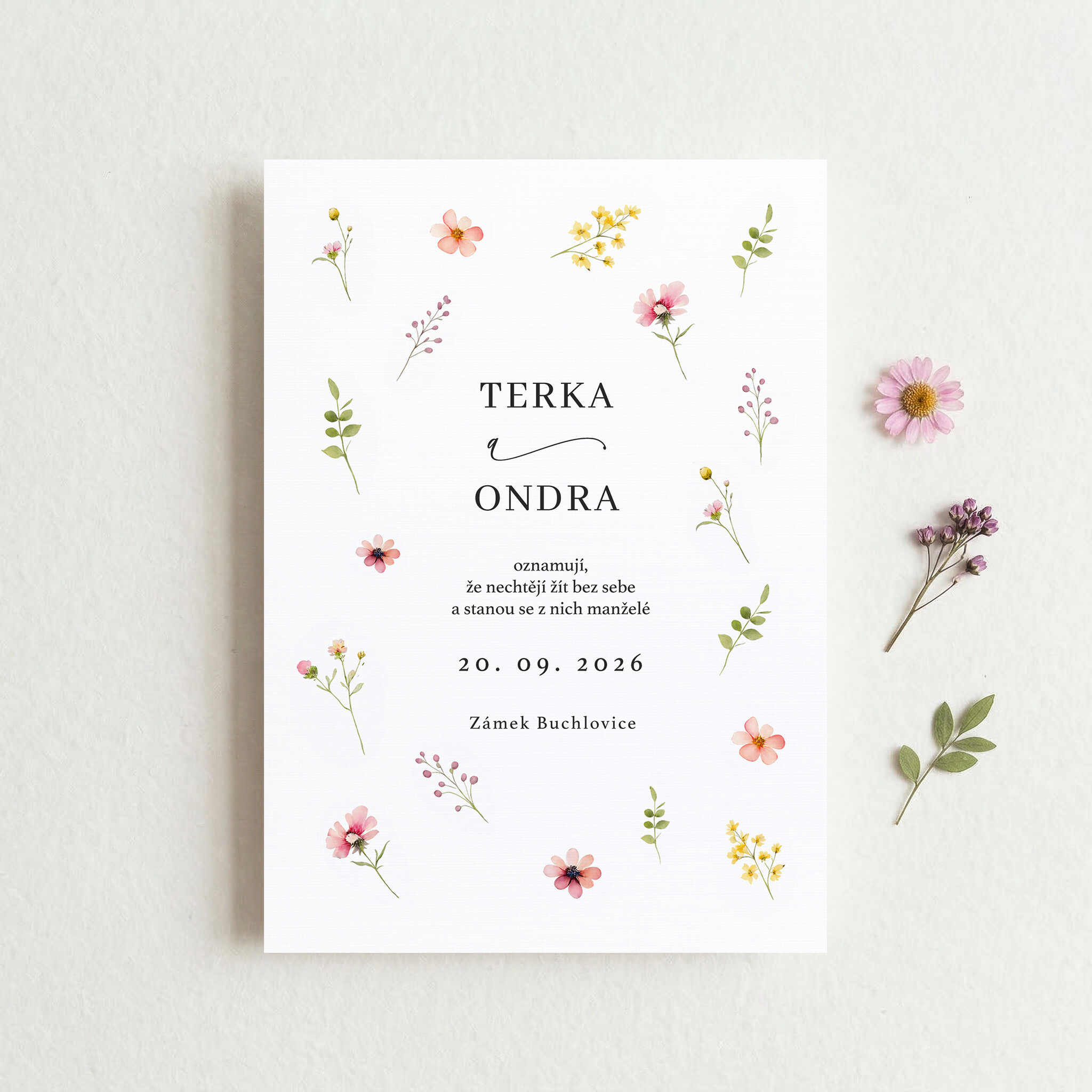 Jemné boho svatební oznámení č. 370 s rozkvetlou luční kompozicí, která ze všech stran obklopuje jména. Na přání k oznámení vytvoříme i další tiskoviny ve stejném designu. Například menu, jmenovky nebo doplňkové kartičky.
